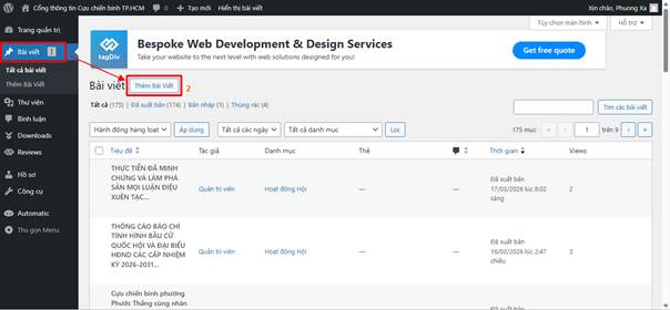 Hình minh họa: Menu Bài viết và nút Thêm bài viết