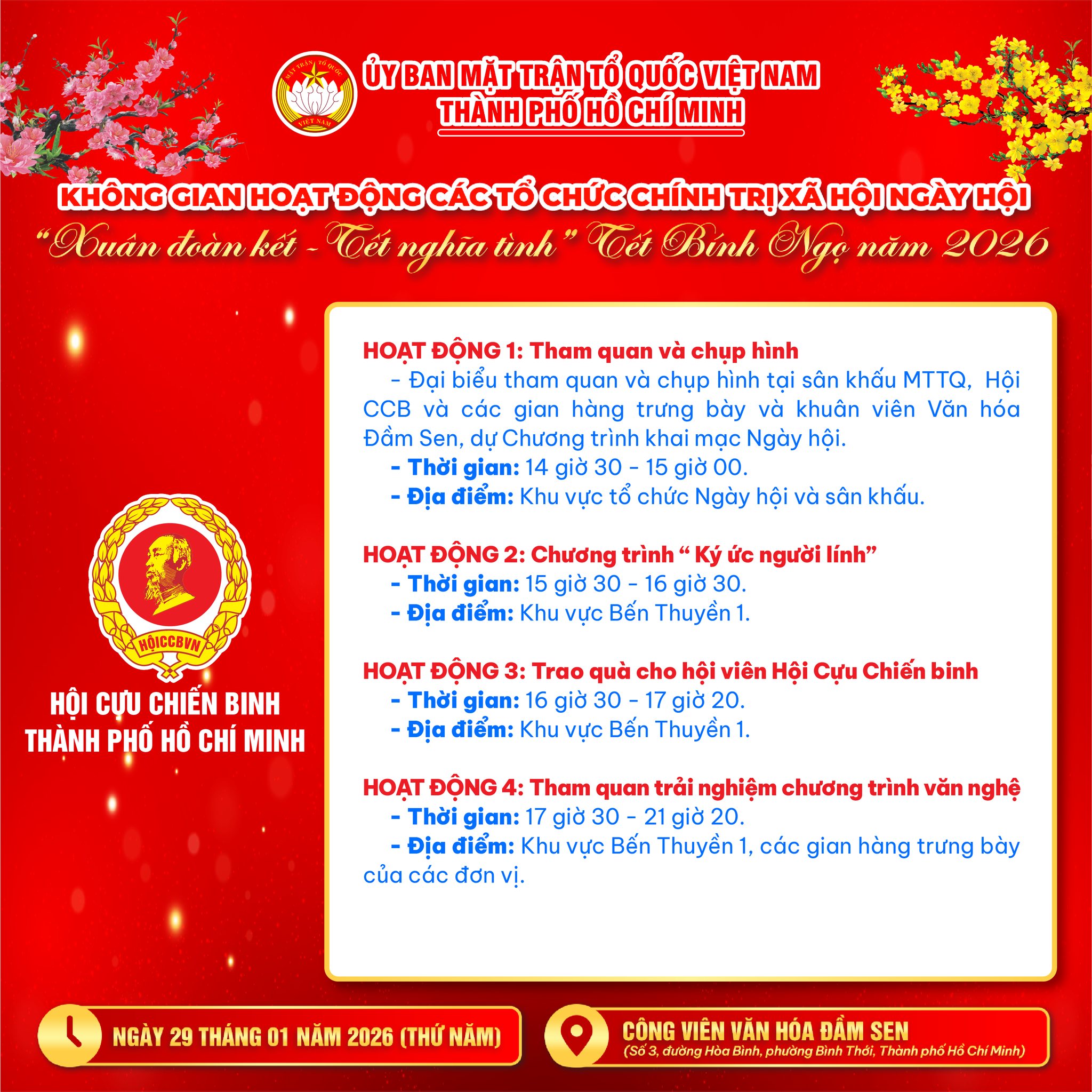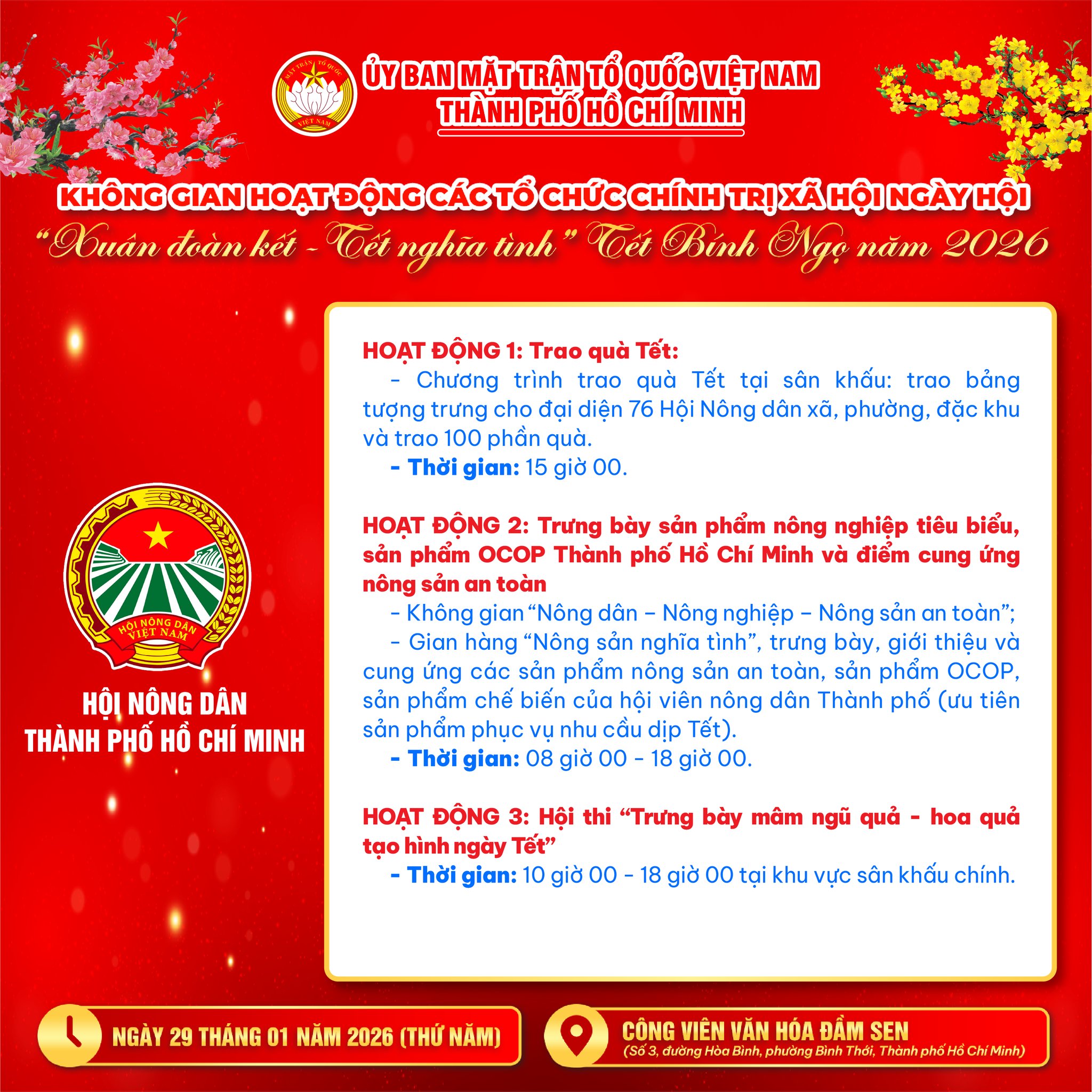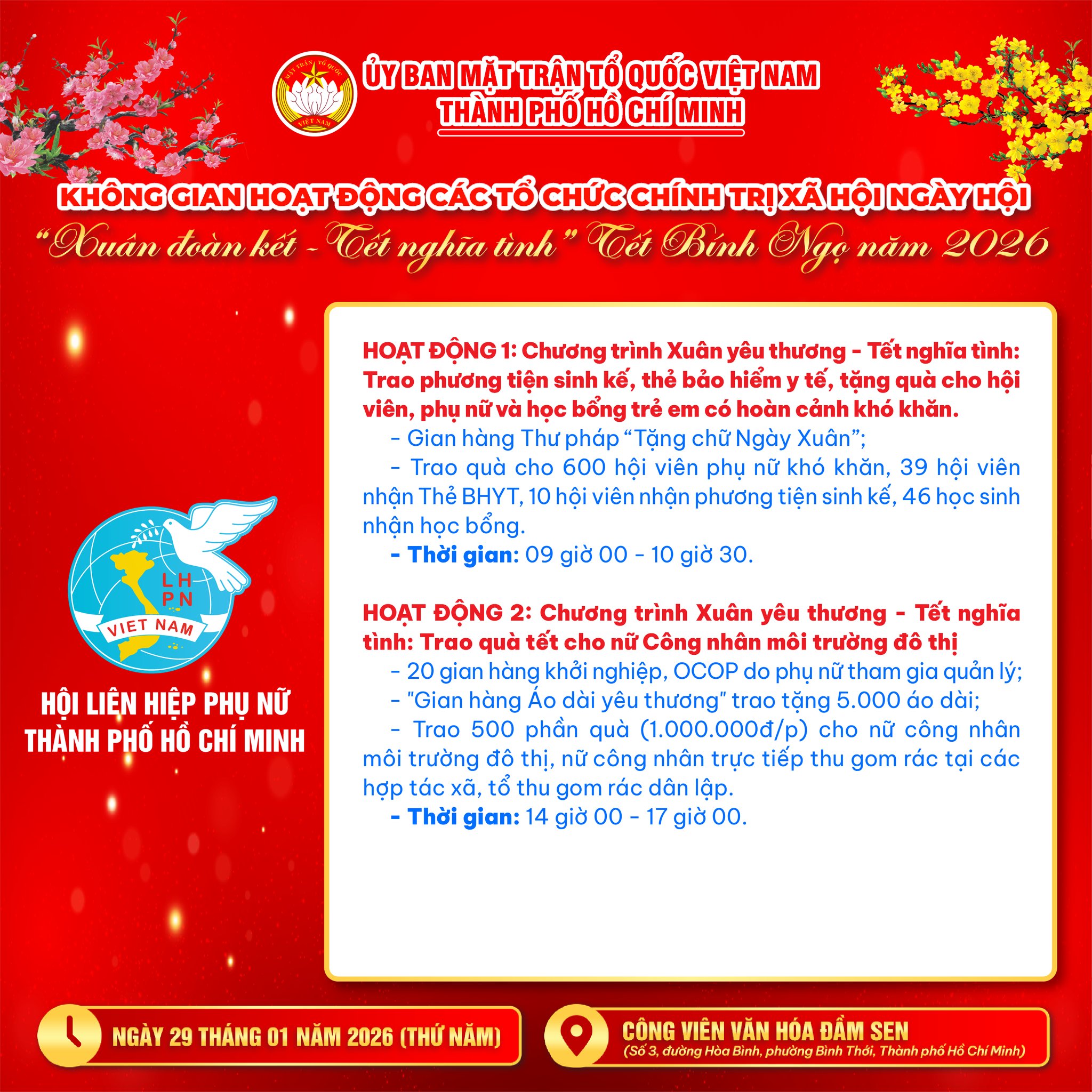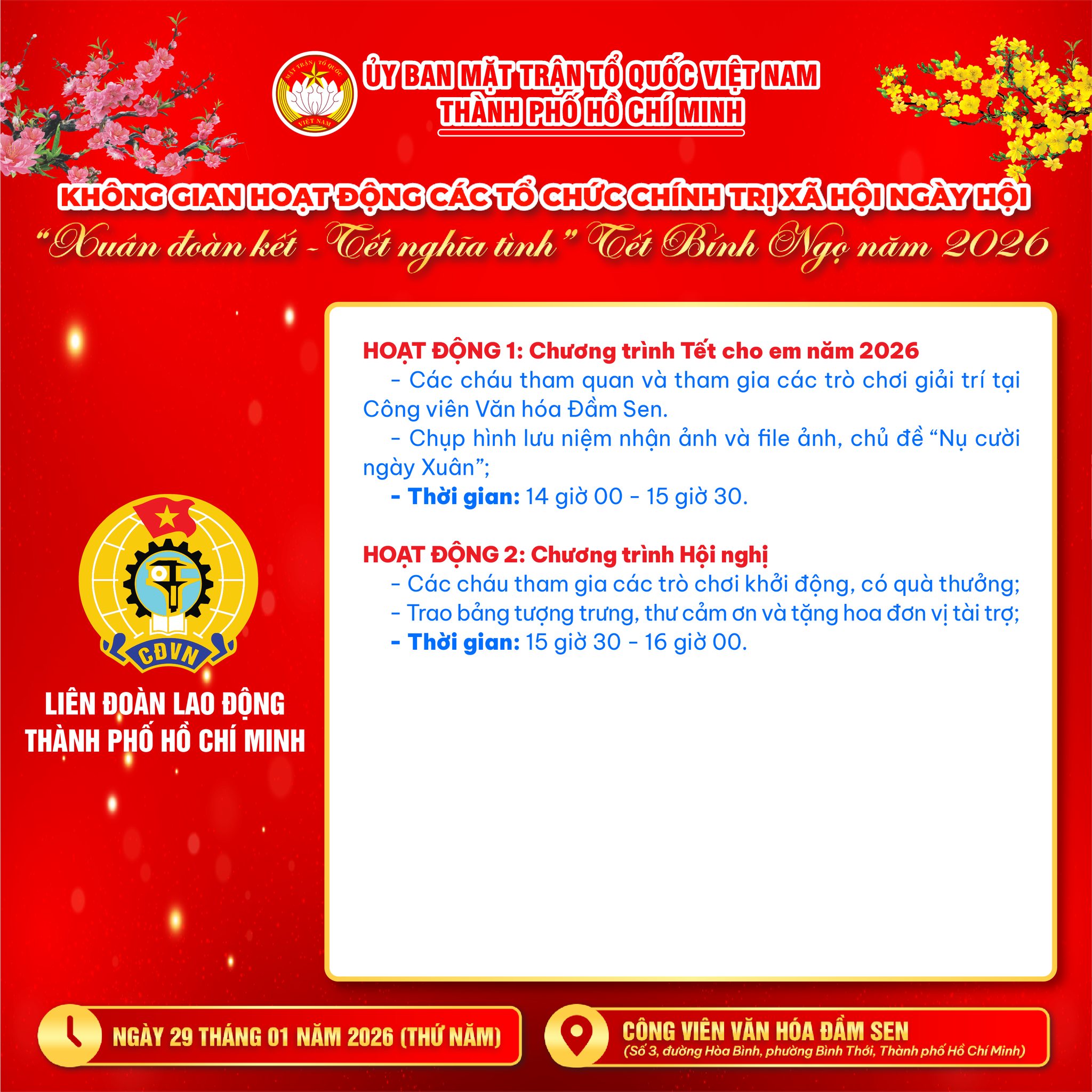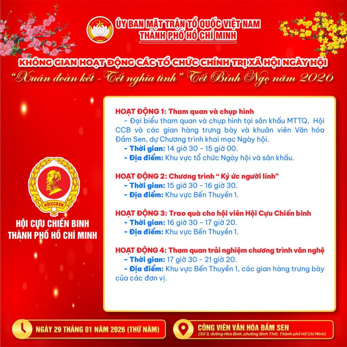 Trong khuôn khổ Ngày hội “Xuân đoàn kết – Tết nghĩa tình” (Tết Bính Ngọ 2026), tại Công viên Văn hóa Đầm Sen (29/01/2026), các tổ chức chính trị – xã hội Thành phố mang đến chuỗi hoạt động vừa rộn ràng, vừa ấm áp và nghĩa tình